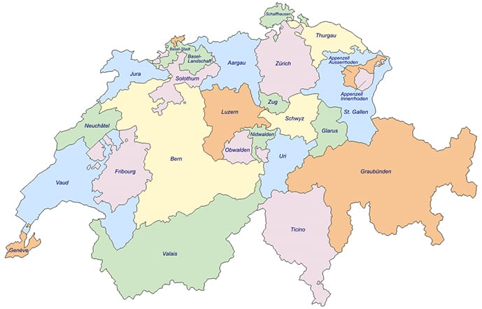 Il existe 26 cantons en Suisse, officiellement appelés les États fédérés de la Confédération suisse. Ils fonctionnent de manière indépendante et possèdent chacun leur constitution et leur parlement. L’ensemble de ces cantons se réunit au Conseil des États pour agir à un échelon national.