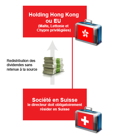 Il est recommandé de détenir les parts d’une sociétés suisse au travers d’une holding à Hong Kong ou en Europe afin d’éviter la retenue à la source de 35%